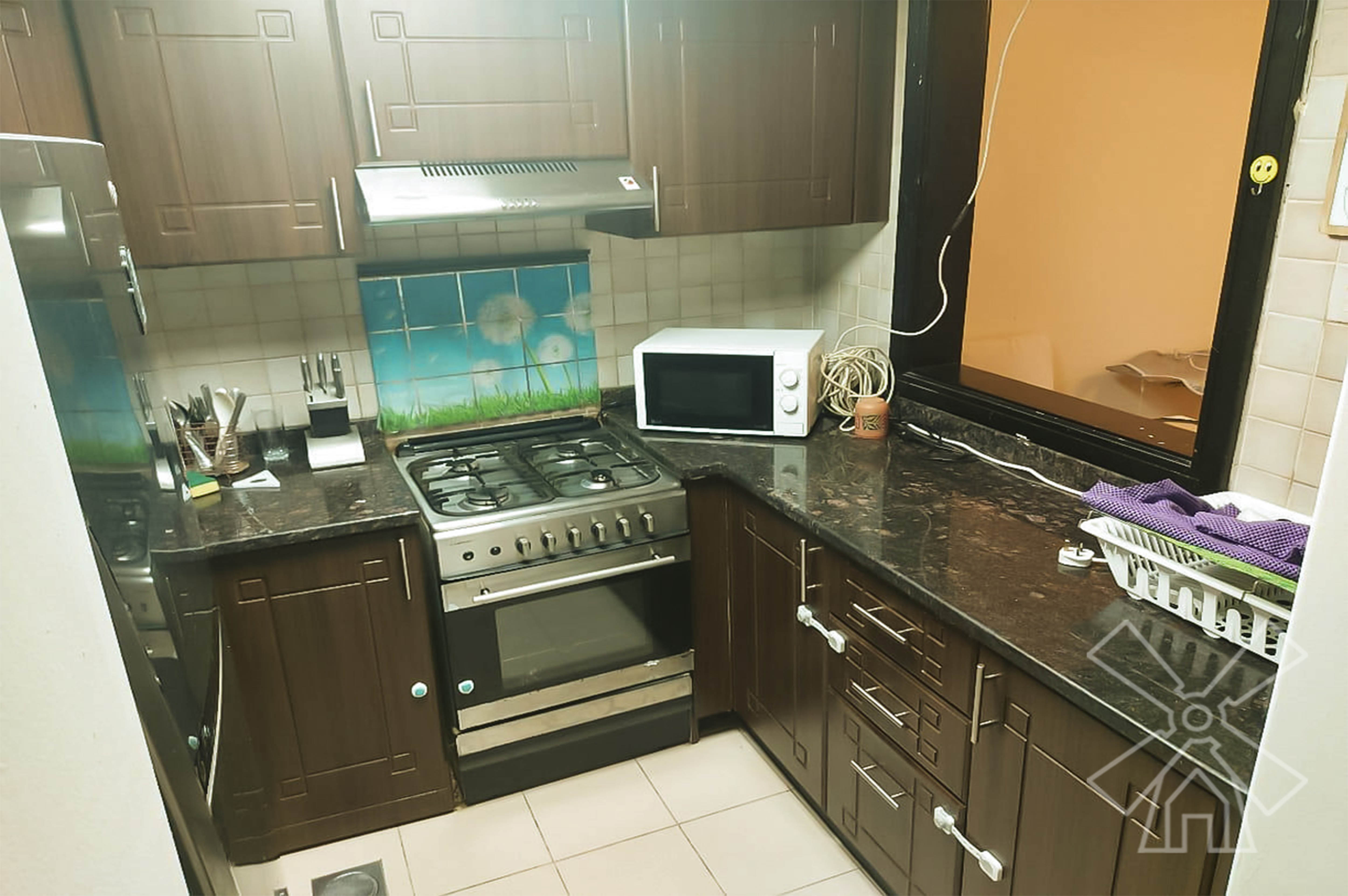 The living and dining area is bright and inviting, featuring a sofa set, armchair, coffee table, TV unit, and a dining table with chairs. A sliding window open onto a balcony, allowing plenty of natural light and offering an outdoor extension of the living space. The separate kitchen is fully equipped with ample cabinetry, a gas stove with oven, refrigerator, microwave, and sufficient counter space, making it suitable for everyday cooking and storage.